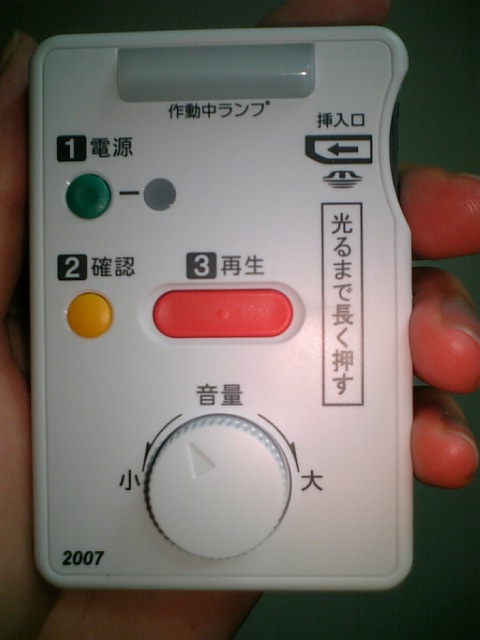 ボタンが「電源」「確認」「再生」しかないんですよ。まあ、「一時停止」とか「巻き戻し」とかあったら、リスニングテストになりませんから、当然なんですがね。