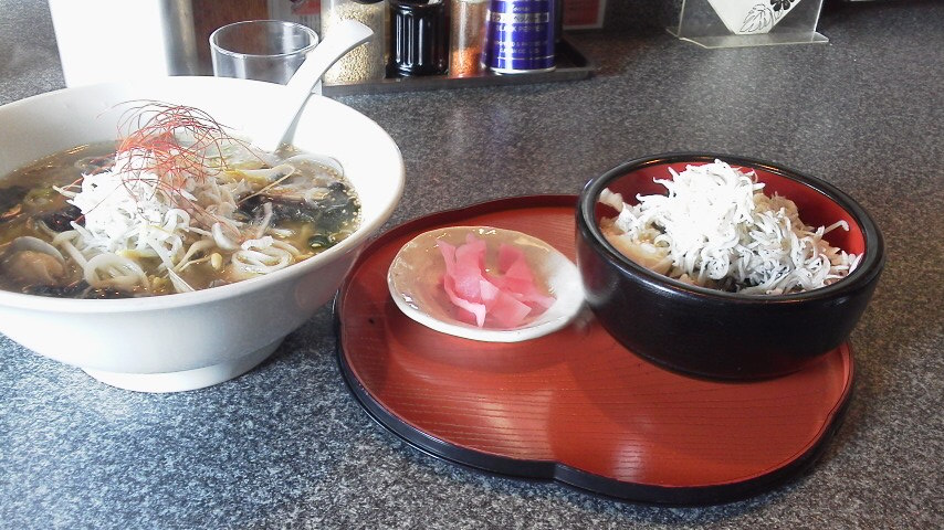 ラーメンにハーフしらす丼をセットにできるっていうんで、「ええい!ここだ。入っちまえ」と思って暖簾をくぐりました。