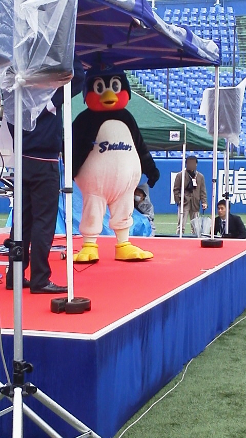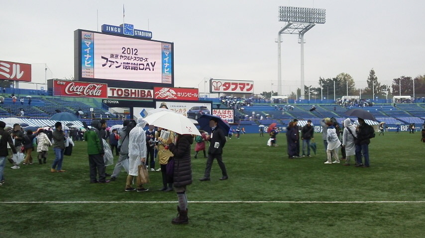 あ、ちなみに、写真の右のほうでレインコート着てインタビューしてるの、尾形沙耶香さんです。スワローズTVの収録ですかね。