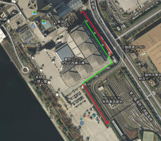 右上側の赤い部分がスロープです。これを地図上側に下って、緑色は4階の屋外通路の下(1階部分)です。突き当たりで右折して赤に繋がってる部分、ここで私は諦めました。赤い矢印の方向、最後尾が見えませんでしたから……