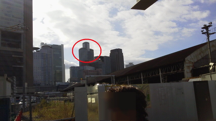 そのホテルを、ヨドバシカメラ裏手の、梅田スカイビルのほうに抜ける地下道の入り口あたりから撮影。手前の建物との位置関係から考えると、ここだと思うんですよ。