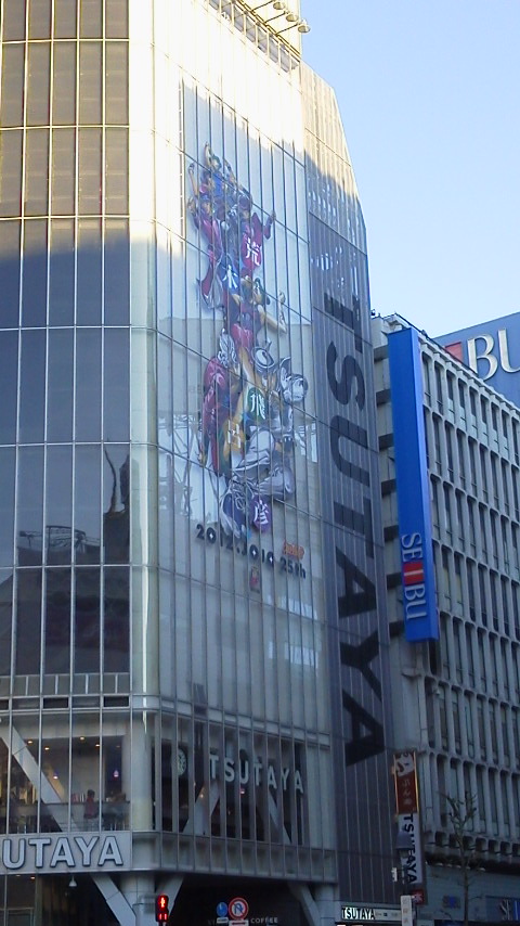 渋谷駅には「ハチ公改札」ってのがあるんですね。ハチ公像に近いその改札から出ると、正面に荒木先生の絵が輝くTSUTAYA。